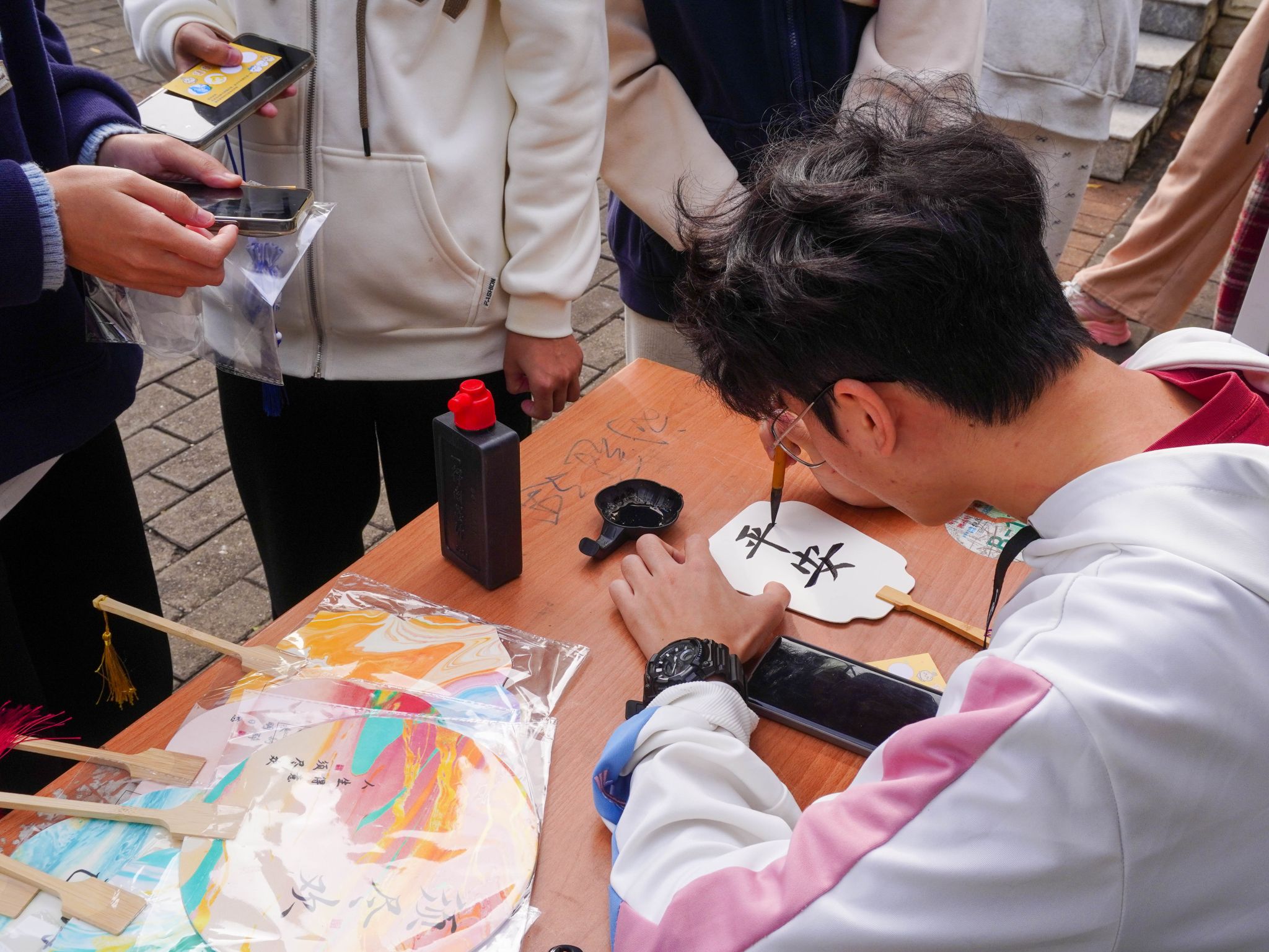 活动现场,四大摊位各展风采。“香启廉心”摊位设置灯谜、香囊二选一体验,同学们或沉吟猜谜,或巧制香囊,让“廉”心在潜移默化中生根发芽;“正义漆扇”摊位由参与者执扇而作,天然漆料在扇面上挥洒,感受千年漆艺从流动到凝固的生命律动;“妙手染青团”摊位上,国家级非遗扎染于此邂逅青春,蓝白相映的图案,是写意在素布上的独一无二的东方诗篇;“拼创未来”摊位将电子元件拆解为模块化拼块,学子们在拼接中感受电子技术的秩序之美,实现科技与非遗的创意融合。